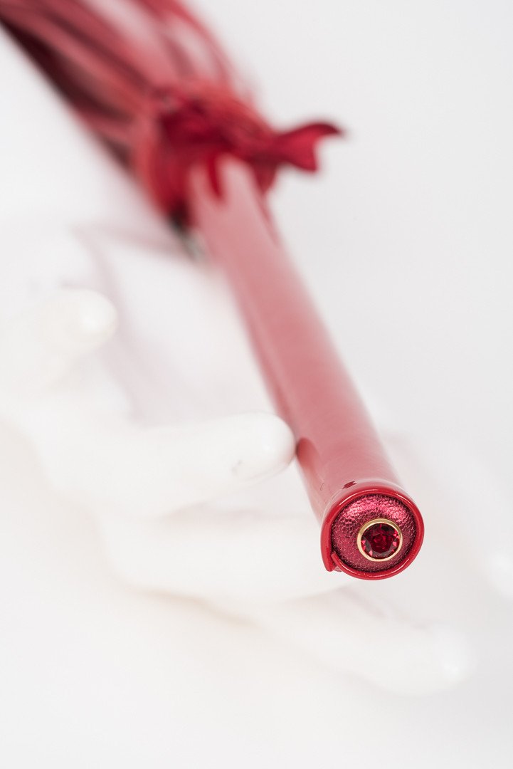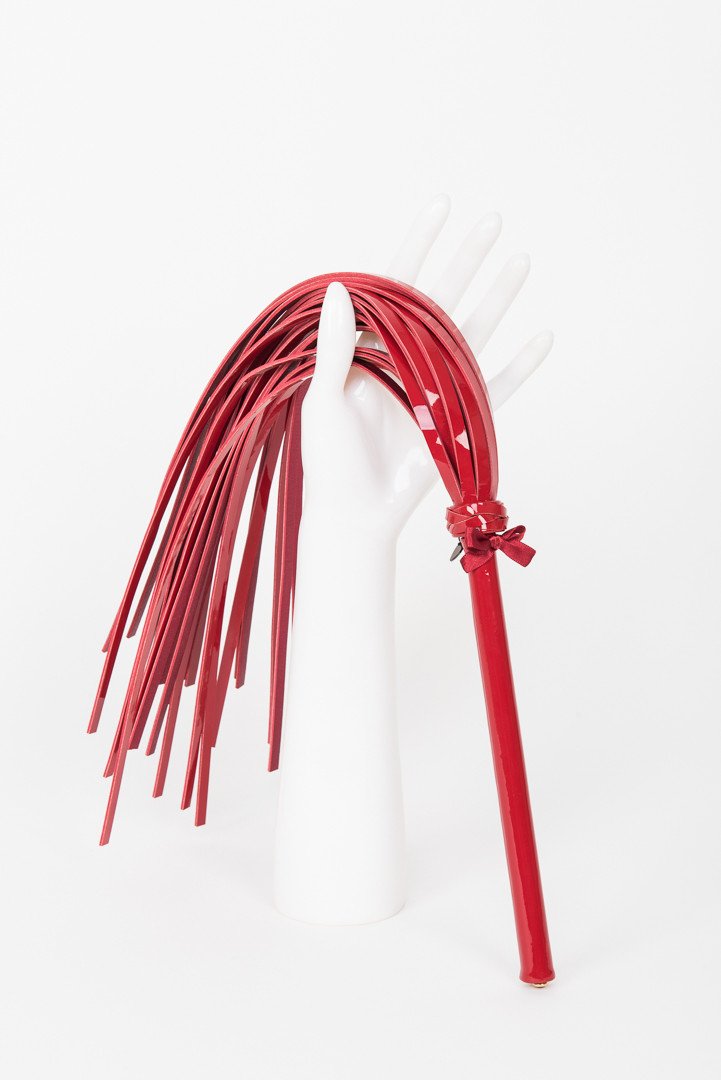 Excite and Tease with the ultimate luxury bedroom accessory! Our Red Hot Flogger is hand crafted from a mix of shiny red patent & metallic gold leathers. Swarovski® Red Siam Gold rimmed crystal rivets add the perfect finishing touches for this high fashion kinky accessory.