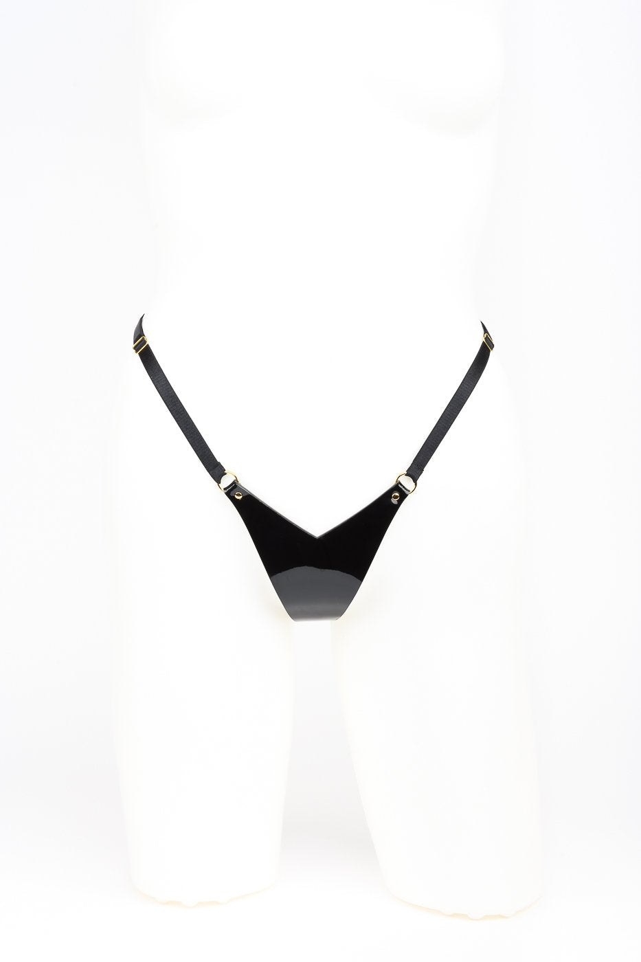 Embellish your body with our Gold Letter mini leather string! Handcrafted to order from black patent & matte leather with Laser Cut Fk logo and 24k gold double cap rivets and trims. Adjustable satin elastic for easy size adjustments. Indulge in luxury bondage!